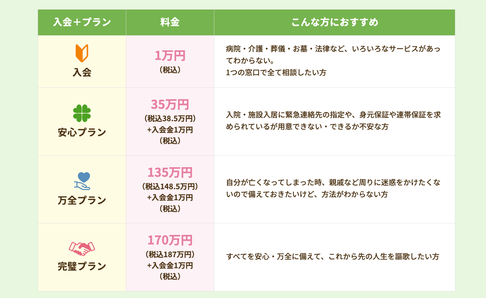 | サポート内容 | ・関係者への連絡 ・葬儀、納骨 ・行政手続き ・遺品整理 ・相続の手続き支援 ・各種解約手続き ・公正証書作成 + ・身元保証 ・日常生活支援 ・入院介護支援 ※完璧プランのみ |
